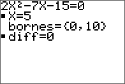 | - | (Advanced) Bornes – {-1E99, 1E99} représente la droite des nombres réels pour la calculatrice : {-1x1099, 1x1099}. Vous pouvez modifier cet intervalle de façon à le rendre plus proche de votre estimation de la solution, en particulier si vous prévoyez plusieurs solutions, comme dans le cas d'une équation du second degré. |