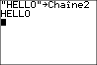 | 5. | Appuyez sur Í pour mémoriser la chaîne de caractères dans la variable de chaîne sélectionnée. Dans l'écran de calcul, la chaîne de caractères est affichée sur la ligne suivante sans guillemets. |