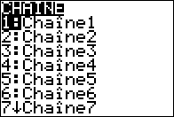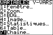 | 1. | Appuyez sur ½ pour afficher le menu VARIABLES. Placez le curseur sur 7:Chaîne. |