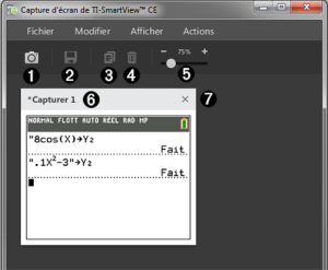 You are here:TI-82 Advanced eGuide > Logiciels & Outils pédagogiques > L’émulateur interactif TI-SmartView™ CE pour la famille TI-83 > Zones de la fenêtre Screen Capture (Capture d'écran)