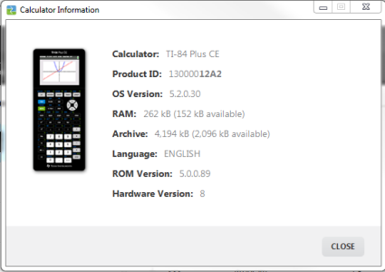 Le logiciel TI Connect™ CE vous permet d'afficher les informations relatives au type, à l'ID du produit, la version du système d'exploitation, la mémoire RAM, la mémoire Archive, la langue, la version de la mémoire ROM et la version du matériel.