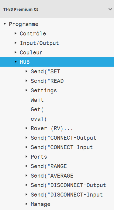 L'éditeur de programmes prend en charge le menu TI-Innovator™ HUB pour les instructions TI-Innovator™ et TI-Innovator™ Rover. Le menu HUB se trouve dans le menu Program (Programme) de l'arborescence du catalogue. Cette addition du menu HUB à l'éditeur de programmes TI Connect™ CE est l'équivalent du menu HUB lorsque l'application Hub est chargée sur la calculatrice CE. Veillez à toujours utiliser les dernières versions du système d'exploitation CE et de l'application CE Hub.