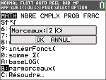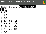 Notez que si une forme d'intervalle est sélectionnée dans le menu CONDITIONS, elle sera collée dans le format logique approprié pour un intervalle comme, par exemple, -2 + X and X + 5. Il s'agit du format correct pour toutes les fonctions de la calculatrice de façon à aboutir au résultat de test logique attendu True (Vrai)(1)/False (Faux)(0) et à l'intervalle pour la variable X correct dans la représentation graphique par morceaux.