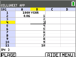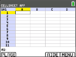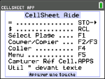 Appuyez sur n’importe quelle touche pour afficher la feuille de calcul. La ligne de saisie avec la référence de cellule s’affiche sur le côté gauche. La touche de fonction Menu s’affiche au-dessus de la touche [F5], comme indiqué dans l’écran d’aide CellSheet. |