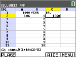 Entrez la formule =$A$1*(1+$A$2)^B2. Remarque : Vous devez utiliser le symbole $ car, pour copier la formule vers le bas de la colonne, vous devez créer une référence absolue aux cellules A1 et A2 pour être sûr que le capital d’origine et le taux d’intérêt restent les mêmes dans chaque formule copiée. (Consultez les touches de raccourci à l’écran pour le signe = a et $ `lors de l’édition d’une cellule.)
