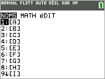 ãAä, ãBä, ãCä, ... , ãJä Pour saisir un nom de matrice : Appuyez sur ¾. Le menu Matrix Names (Noms de matrice) s'affiche. Appuyez sur le nombre du clavier qui correspond au nom de matrice souhaité.