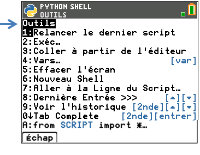 | • | Pour interrompre un script Python en cours d'exécution, par exemple lorsqu'un script se trouve dans une boucle infinie, appuyez sur É. Appuyez sur [Outils] (q) > 6:Nouveau Shell comme méthode alternative pour arrêter un script en cours d'exécution. |