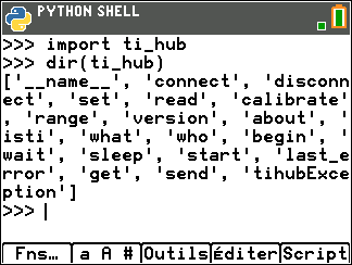 Remarque : Si vous possédez des scripts Python créés dans d'autres environnements de développement Python, modifiez-les pour la solution TI-Python. Les modules peuvent employer des méthodes, des arguments et un ordre des méthodes dans un script qui sont différents de ceux utilisés dans les modules ti_system, ti_plotlib, ti_hub et ti_rover. De manière générale, soyez toujours attentif aux questions de compatibilité lorsque vous utilisez une quelconque version du langage et des modules Python.