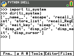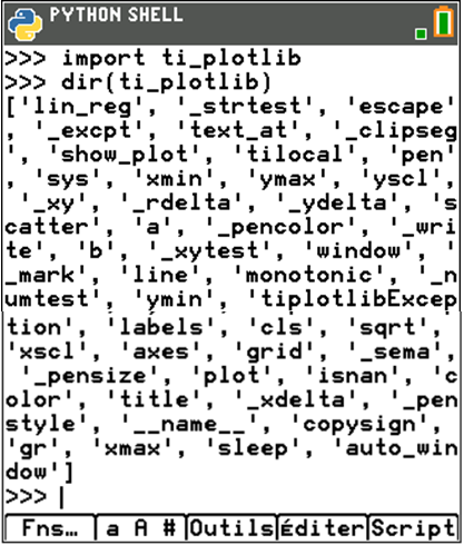 | - | Les scripts qui utilisent des bibliothèques propres à une plateforme – matplotlib (pour ordinateur), ti_plotlib, ti_system, ti_hub, etc. pour les plateformes TI – devront être modifiés avant de pouvoir être exécutés sur une plateforme différente. |