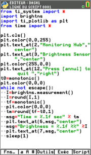 Utilisez les exemples de scripts suivants pour vous familiariser avec les méthodes décrites à la section Référence. Par ailleurs, ces exemples comprennent plusieurs scripts TI-Innovator™ Hub et TI-Innovator Rover™ qui faciliteront votre prise en main du langage TI-Python.