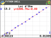 Tout d'abord, saisissez deux listes dans le système d'exploitation (OS) CE. Puis, par exemple, calculez [stat] CALC 4:LinReg(ax+b) pour vos listes. Cela permet de stocker l'équation de régression dans RegEQ dans l'OS. Voici un script destiné à rappeler RegEQ dans l'expérience Python.