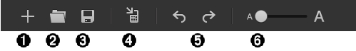 Symbolleiste - Klicken Sie auf diese Symbole, um folgende Aktionen auszuführen: Neues Programm erstellen, Programm öffnen, Programm auf dem Computer speichern, Programm an verbundene(n) Rechner senden, Rückgängig oder Wiederholen und Schriftgrößen-Schieberegler.