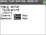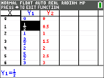 Hinweis: Im Tabellen-Setup, y -, wird festgelegt, wie Tabellenwerte angezeigt werden. Wenn die Tabellenergebnisse nicht im erwarteten Zahlenformat angezeigt wird, überprüfen Sie die Einstellungen im Tabellen-Setup. Bei einem Mix aus Dezimalzahlen und Brüchen werden Brüche nicht beibehalten.
