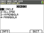 2. Appuyez sur dans l'écran SECT. CONIQUES principal pour afficher les options de parabole. Les équations de paraboles sous forme polaire sont répertoriées.