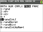 | 2. | Press † until you highlight 5: randInt(, then [enter]. |