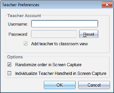 Use la opción de Preferencias del Profesor con el fin de configurar las preferencias para usar la opción de aleatorizar pantalla y para mostrar el dispositivo portátil del profesor. Crear un nombre de usuario y una contraseña le permite a los profesores iniciar sesión en una clase activa. Usted también puede optar por individualizar la vista de la pantalla de su dispositivo portátil cuando ésta se despliegue. Para más información, consulte las guías del dispositivo portátil oneducation.ti.com/guides.