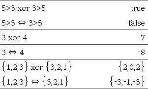 BooleanaExpr1 Û BooleanaExpr2 devuelve expresión booleana BooleanaLista1 Û BooleanaLista2 devuelve lista booleana BooleanaMatriz1 Û BooleanaMatriz2 devuelve matriz booleana Entero1 Û Entero2 devuelve Entero