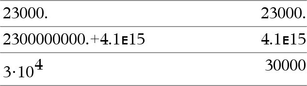 mantisaEexponente Ingresa un número en la notación científica. El número se interpreta como mantisa × 10exponente. Sugerencia: Si usted desea ingresar una potencia de 10 sin causar un resultado de valor decimal, use 10^entero. Nota: Usted puede insertar este operador desde el teclado de la computadora al escribir @E. Por ejemplo, escriba 2.3@E4 para ingresar 2.3E4. |