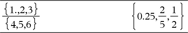Lista1 à Expr Þ lista Entrega una lista que contiene los cocientes de Expr divididos entre Lista1 o deLista1 divididos entre Expr. |