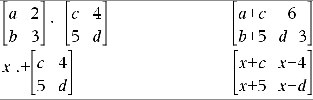 Lista1 + Lista2Þlista Matriz1 + Matriz2Þmatriz Entrega una lista (o matriz) que contiene las sumas de los elementos correspondientes en Lista1 y Lista2 (o Matriz1 y Matriz2). Las dimensiones de los argumentos deben ser iguales. |