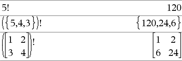 Lista1! Þ lista Matriz1! Þ matriz Entrega el factorial del argumento. Para una lista o matriz, entrega una lista o una matriz de factoriales de los elementos. |