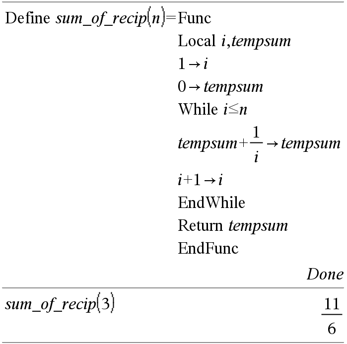 While Condición Bloque EndWhile Ejecuta las sentencias en Bloque siempre y cuando la Condición sea verdadera. Bloque puede ser una sentencia sencilla o una secuencia de sentencias separadas con el caracter ":". Nota para introducir el ejemplo: Para obtener instrucciones sobre cómo introducir las definiciones de programas y funciones en varias líneas, consulte la sección Calculadora de la guía del producto. |
