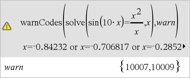 Evalúa la expresión Expr1, entrega el resultado y almacena los códigos de cualquier advertencia generada en la variable de lista varEstado. Si no se genera ninguna advertencia, esta función asigna a varEstado una lista vacía. Expr1 puede ser cualquier expresión matemática de TI‑Nspire™ o de CAS de TI‑Nspire™. Usted no puede usar un comando o asignación como Expr1. VarEstado debe ser un nombre de variable válido. Para obtener una lista de códigos de advertencia y mensajes asociados, vea aquí. |