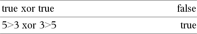 Entier1 xor Entier2 Þ entier Compare les représentations binaires de deux entiers, en appliquant un xor bit par bit. En interne, les deux entiers sont convertis en nombres binaires 64 bits signés. Lorsque les bits comparés correspondent, le résultat est 1 si dans l'un des deux cas (pas dans les deux) il s'agit d'un bit 1 ; le résultat est 0 si, dans les deux cas, il s'agit d'un bit 0 ou 1. La valeur donnée représente le résultat des bits et elle est affichée selon le mode Base utilisé. Les entiers de tout type de base sont admis. Pour une entrée binaire ou hexadécimale, vous devez utiliser respectivement le préfixe 0b ou 0h. Tout entier sans préfixe est considéré comme un nombre en écriture décimale (base 10). Si vous entrez un nombre dont le codage binaire signé dépasse 64 bits, il est ramené à l'aide d'une congruence dans la plage appropriée. Pour de plus amples informations, voir 4Base2, ici. Remarque : voir |