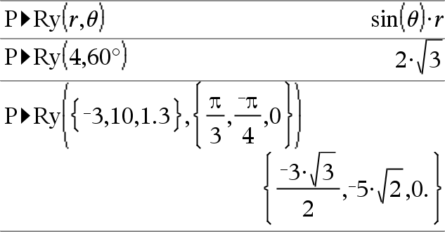P4Ry(ExprR, qExpr)Þexpression P4Ry(ListeR, qListe)Þliste P4Ry(MatriceR, qMatrice)Þmatrice Donne la valeur de l'ordonnée du point de coordonnées polaires (r, q). Remarque : l'argument q est interprété comme une mesure en degrés, en grades ou en radians, suivant le mode Angle utilisé. Remarque : vous pouvez insérer cette fonction à partir du clavier de l'ordinateur en entrant P@>Ry(...). |