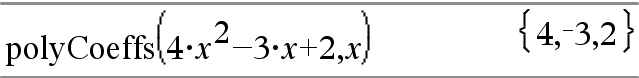 polyCoeffs(Poly [,Var])Þliste Affiche une liste des coefficients du polynôme Poly pour la variable Var. Poly doit être une expression polynomiale de Var Nous conseillons de ne pas omettre Var à moins que Poly ne soit une expression dans une variable unique.