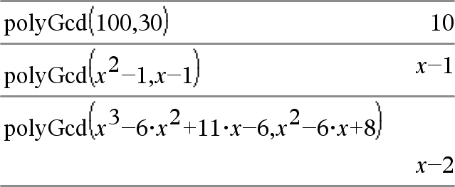 polyGcd(Expr1,Expr2)Þexpression Donne le plus grand commun diviseur des deux arguments. Expr1 et Expr2 doivent être des expressions polynomiales. Les listes, matrices et arguments booléens ne sont pas autorisés. |