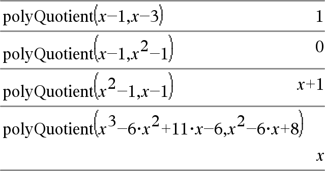 polyRemainder(Poly1,Poly2 [,Var])Þexpression Affiche le reste du polynôme Poly1 divisé par le polynôme Poly2 par rapport à la variable spécifiée Var. Poly1 et Poly2 doivent être des expressions polynomiales de Var. Nous conseillons de ne pas omettre Var à moins que Poly1 et Poly2 ne soient des expressions dans une même variable unique.