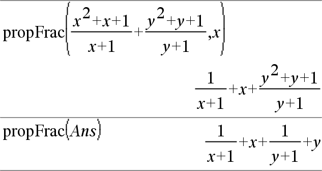 propFrac(expression_rationnelle,Var) donne la somme des fractions propres et d'un polynôme par rapport à Var. Le degré de Var dans le dénominateur est supérieur au degré de Var dans le numérateur pour chaque fraction propre. Les mêmes puissances de Var sont regroupées. Les termes et leurs facteurs sont triés, Var étant la variable principale. Si Var est omis, le développement des fractions propres s'effectue par rapport à la variable la plus importante. Les coefficients de la partie polynomiale sont ensuite ramenés à leur forme propre par rapport à leur variable la plus importante, et ainsi de suite.
