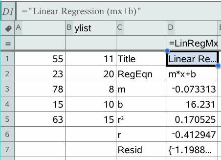 L’application Tableur & listes enregistre les résultats statistiques sous un nom de groupe de variables, sous la forme stat.nnn, où nnn est le nom du résultat (par exemple, stat.RegEqn et stat.Resid). Vous pouvez modifier la formule indiquée dans la cellule de formule de la colonne, afin d’utiliser un nom de groupe de variables personnalisé au lieu du nom standard. Vous pouvez ainsi utiliser la formule suivante pour stocker les résultats dans le groupe de variables MystatsB.