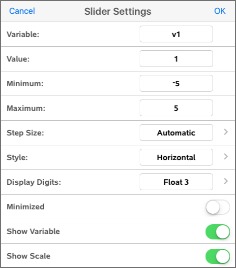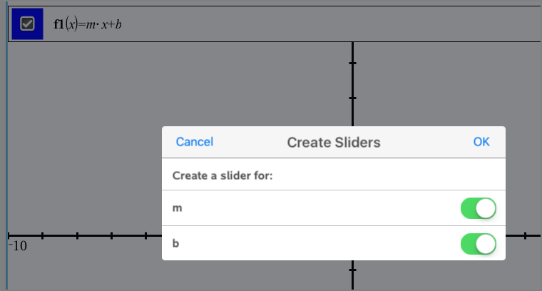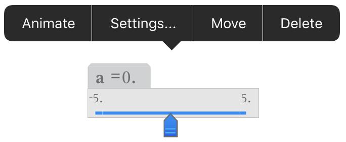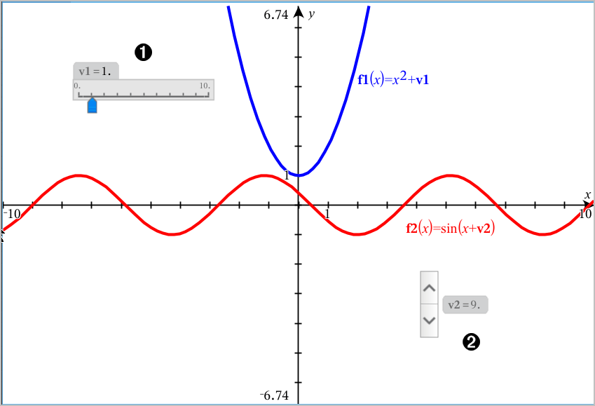 Des curseurs peuvent être créés automatiquement dans l’application Graphiques et dans la fenêtre Analyse de l’application Géométrie. Quand vous définissez certaines fonctions, équations ou suites faisant référence à des variables non définies, des curseurs automatiques sont créés.