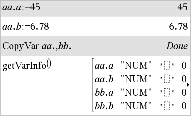 CopyVar Var1, Var2 CopyVar Var1., Var2. CopyVar Var1, Var2 copie la valeur de la variable Var1 dans la variable Var2 et crée Var2, si nécessaire. La variable Var1 doit avoir une valeur. Si Var1 correspond au nom d'une fonction existante définie par l'utilisateur, copie la définition de cette fonction dans la fonction Var2. La fonction Var1 doit être définie. Var1 doit être conforme aux règles de dénomination des variables ou correspondre à une expression d'indirection correspondant à un nom de variable conforme à ces règles. |