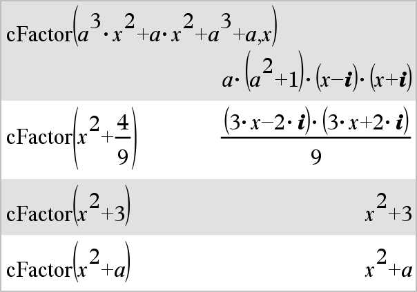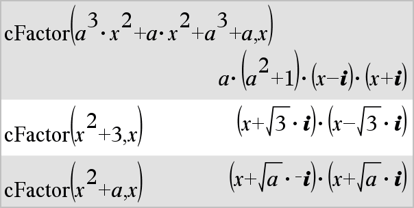cFactor(Expr1) factorise Expr1 dans C en fonction de toutes ses variables et sur un dénominateur commun. La factorisation de Expr1 décompose l'expression en autant de facteurs rationnels linéaires que possible même si cela introduit de nouveaux nombres non réels. Cette alternative peut s'avérer utile pour factoriser l'expression en fonction de plusieurs variables. |