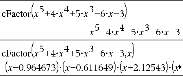 Avec le réglage Auto du mode Auto ou Approché (Approximate) l'utilisation de Var permet également une approximation avec des coefficients en virgule flottante dans le cadre de laquelle les coefficients irrationnels ne peuvent pas être exprimés explicitement suivant les termes des fonctions intégrées. Même en présence d'une seule variable, l'utilisation de Var peut contribuer à une factorisation plus complète. Remarque : voir aussi factor(). |