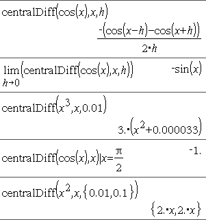 Affiche la dérivée numérique en utilisant la formule du quotient à différence centrée. Quand la valeur est spécifiée, celle-ci prévaut sur toute affectation de variable ou substitution précédente de type « | » pour la variable. Incrément correspond à la valeur de l'incrément. Si Incrément n'est pas spécifié, il est fixé par défaut à 0,001. Si vous utilisez Liste1 ou Matrice1, l'opération s'étend aux valeurs de la liste ou aux éléments de la matrice. Remarque : voir aussi avgRC() |