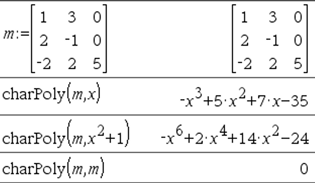 charPoly(matriceCarrée,Var)Þexpression polynomiale charPoly(matriceCarrée,Expr)Þexpression polynomiale charPoly(matriceCarrée1,matriceCarrée2)Þexpression polynomiale Donne le polynôme caractéristique de matriceCarrée. Le polynôme caractéristique d'une matrice n×n A, désigné par pA(l), est le polynôme défini par pA(l) = det(l• I NA) où I désigne la matrice identité n×n. matriceCarrée1 et matriceCarrée2 doivent avoir les mêmes dimensions. |