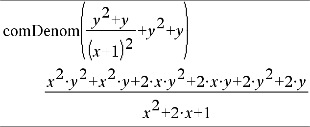 comDenom(Expr1) donne le rapport réduit d'un numérateur entièrement développé sur un dénominateur entièrement développement. |