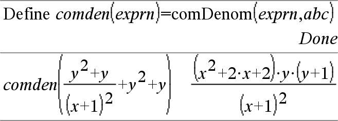 comDenom(Expr1[,Var])Þexpression comDenom(Liste1[,Var])Þliste comDenom(Matrice1[,Var])Þmatrice