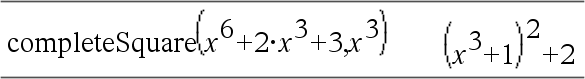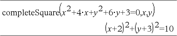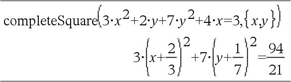 Convertit une expression polynomiale du second degré de type a·x2+b·x+c en a·(x-h)2+k. - ou - Convertit une équation du second degré de type x2+b·x+c=d en a·(x-h)2=k. Le premier argument doit être une expression ou une équation du second degré en notation standard par rapport au deuxième argument. Le deuxième argument doit être un terme à une seule variable ou un terme à une seule variable élevé à une puissance rationnelle (par exemple x, y2 ou z(1/3). Le troisième et le quatrième tentent de compléter le carré en fonction des variables Var1, Var2 [,… ]). |