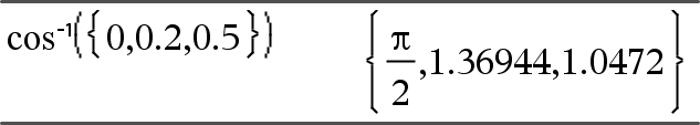 cos/(Liste1) donne la liste des arcs cosinus de chaque élément de Liste1. Remarque : donne le résultat en degrés, en grades ou en radians, suivant le mode angulaire utilisé. Remarque : vous pouvez insérer cette fonction à partir du clavier en entrant arccos(...). |
