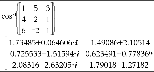 cos/(matriceCarrée1)ÞmatriceCarrée Donne l'arc cosinus de matriceCarrée1. Ce calcul est différent du calcul de l'arc cosinus de chaque élément. Pour plus d'informations sur la méthode de calcul, reportez-vous à cos(). matriceCarrée1 doit être diagonalisable. Le résultat contient toujours des chiffres en virgule flottante. |