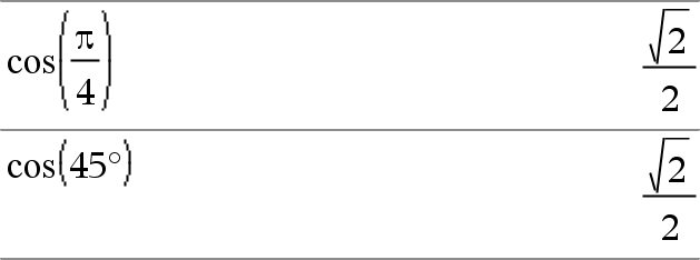 cos(Liste1) donne la liste des cosinus des éléments de Liste1. Remarque : l'argument est interprété comme la mesure d'un angle en degrés, en grades ou en radians, suivant le mode angulaire en cours d'utilisation. Vous pouvez utiliser ¡, G ou R pour préciser l'unité employée temporairement pour le calcul. |