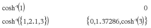 cosh/(Liste1) donne la liste des arguments cosinus hyperboliques de chaque élément de Liste1. Remarque : vous pouvez insérer cette fonction à partir du clavier en entrant arccosh(...). |