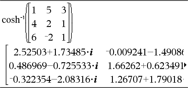 cosh/(matriceCarrée1)ÞmatriceCarrée Donne l'argument cosinus hyperbolique de la matrice matriceCarrée1. Ce calcul est différent du calcul de l'argument cosinus hyperbolique de chaque élément. Pour plus d'informations sur la méthode de calcul, reportez-vous à cos(). matriceCarrée1 doit être diagonalisable. Le résultat contient toujours des chiffres en virgule flottante. |