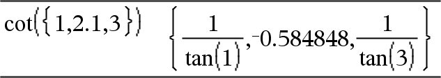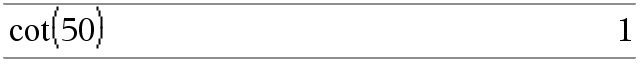 cot(Expr1) Þ expression cot(Liste1) Þ liste Affiche la cotangente de Expr1 ou retourne la liste des cotangentes des éléments de Liste1. Remarque : l'argument est interprété comme la mesure d'un angle en degrés, en grades ou en radians, suivant le mode angulaire en cours d'utilisation. Vous pouvez utiliser ¡, G ou R pour préciser l'unité employée temporairement pour le calcul. |
