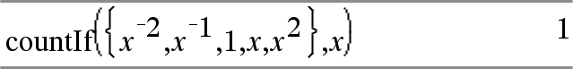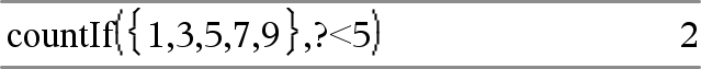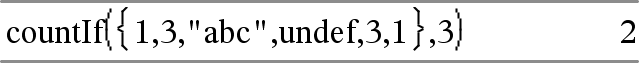 countif(Liste,Critère)Þvaleur Affiche le nombre total d'éléments dans Liste qui répondent au critère spécifié. Le critère peut être :